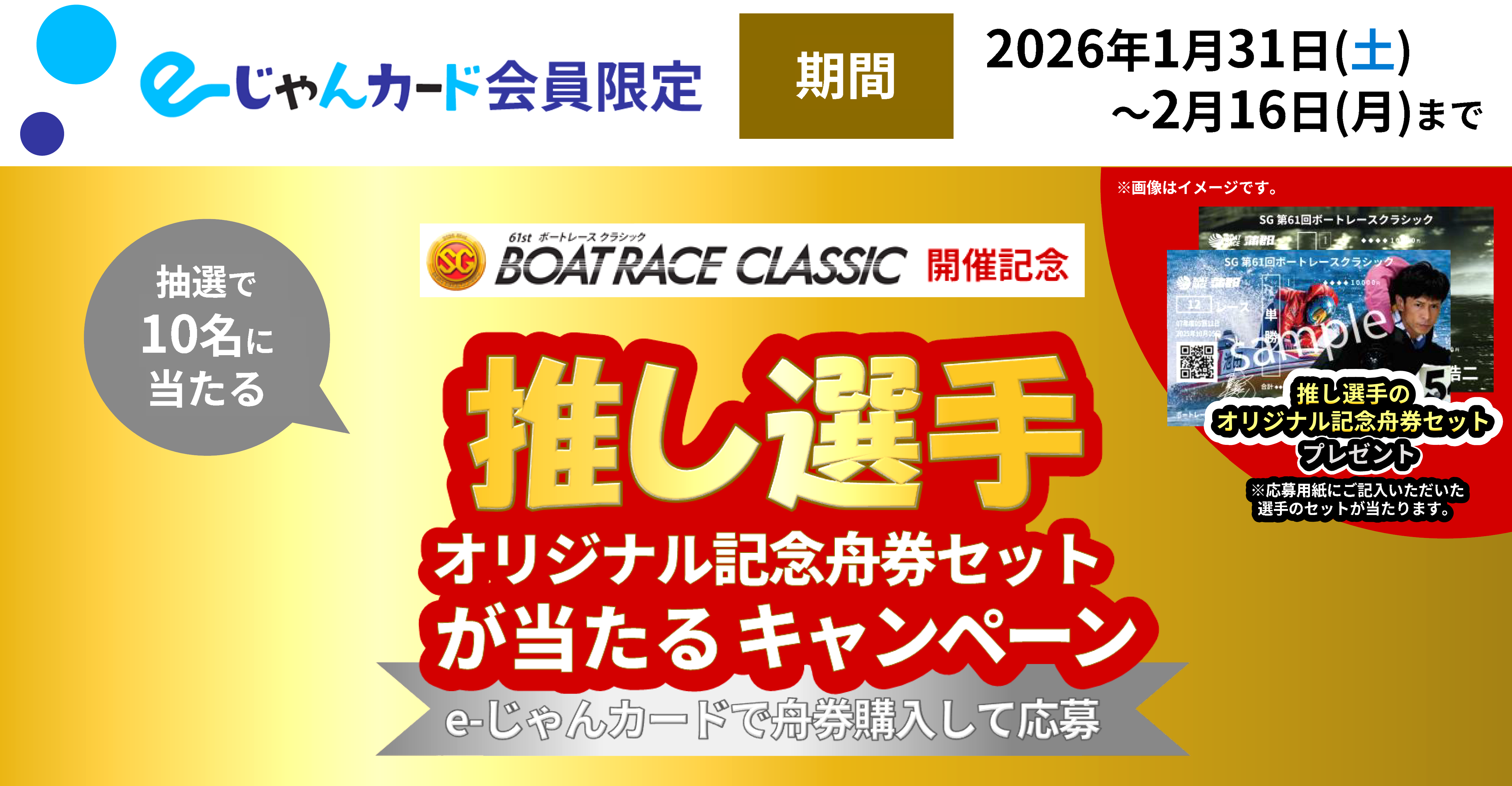 専用ブースにある応募用紙に必要事項を記入の上、下記レース期間中にe―じゃんカードで100円以上の舟券を購入すると、お選びいただいた「SG第61回ボートレースクラシック」出場予定選手のホログラム版オリジナル記念舟券セットが抽選で10名様に当たります!